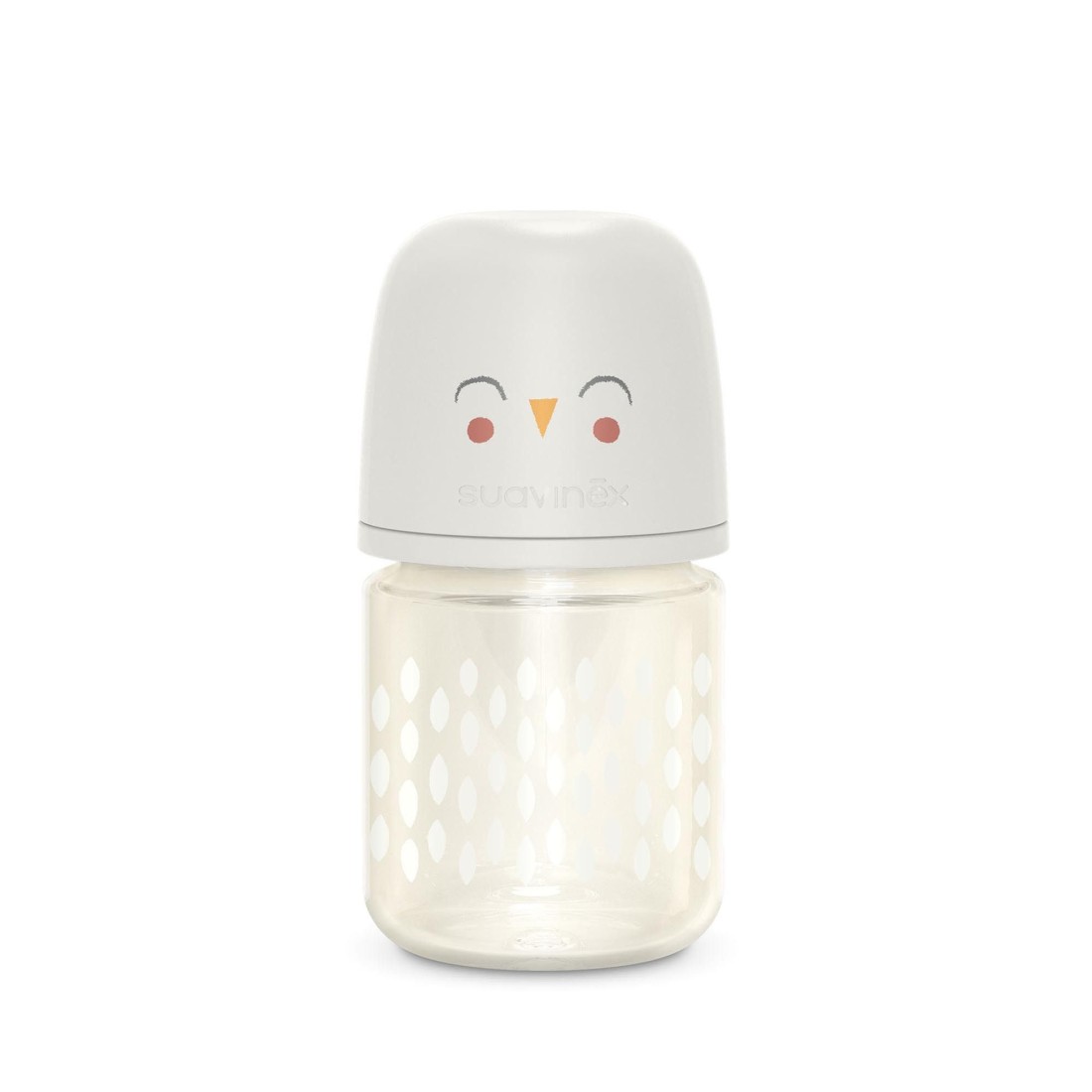 Γυάλινο μπιμπερό χωρητικότητας 120ml.Η στρογγυλή θηλή σιλικόνης με το επίπεδο και συμμετρικό σχήμα είναι κατασκευασμένη ώστε να είναι πάντα σωστά τοποθετημένο στο στόμα του μωρού, ασκώντας ελάχιστη πίεση στον ουρανίσκο.Η θηλή είναι αργής ροής για 0-6 μηνών, κατάλληλη για τις πρώτες ημέρες και για την παροχή νερού.Έχει φαρδύ λαιμό και βάση που κάνει εύκολη την προετοιμασία και την καθαριότητα του μπιμπερό και το καθιστούν πιο σταθερό.Το εργονομικό του σχήμα καθιστά το κράτημα ασφαλέστερο και πιο άνετο κατά τη διάρκεια του γεύματος.Τα χρώματα που χρησιμοποιούνται για τη διακόσμηση των προϊόντων είναι φυσικά και μη τοξικά.Χωρίς BPA, κλινικά ελεγμένα και κατασκευασμένα εντός ΕΕ από Ισπανό φαρμακευτικό κατασκευαστή.