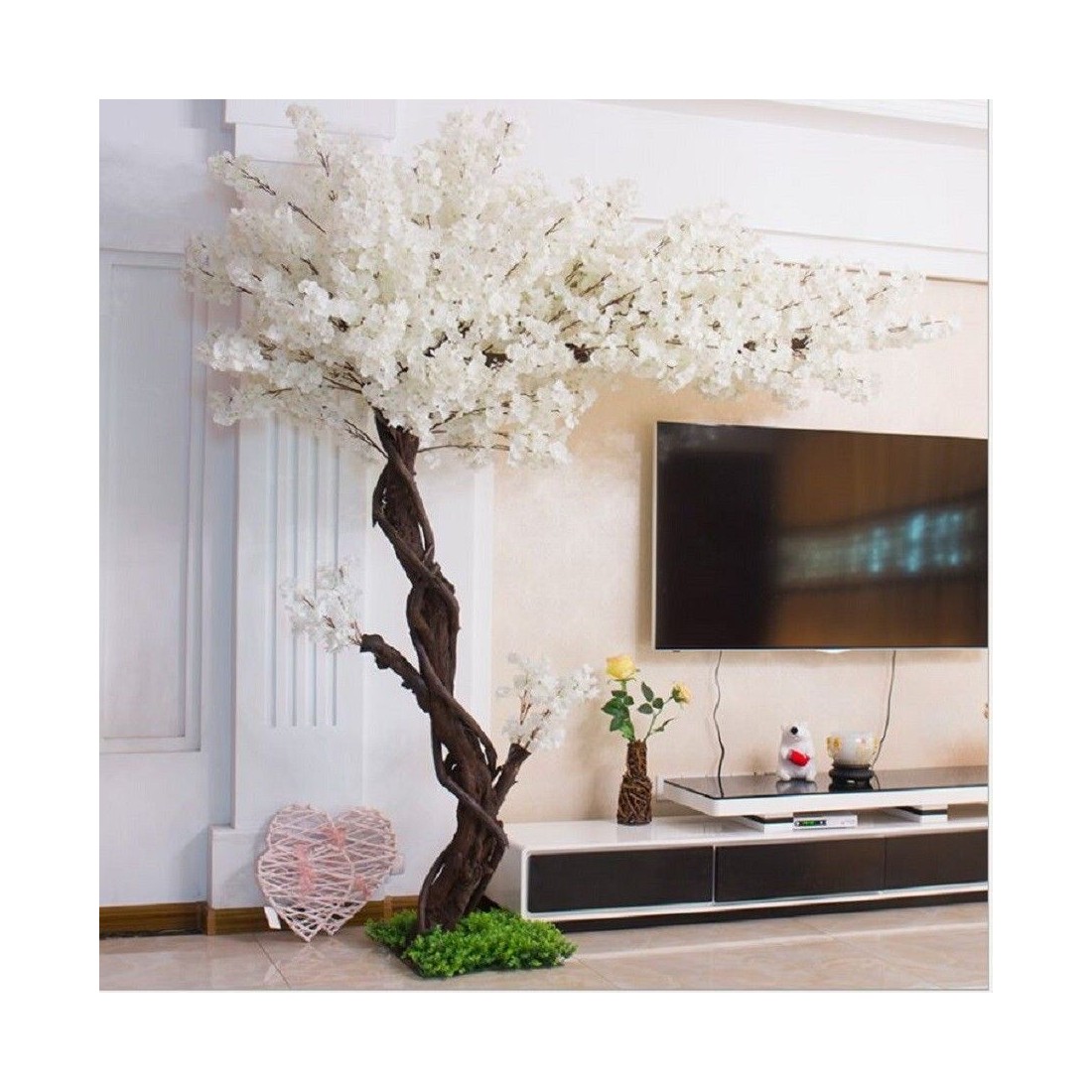 Τεχνητή ανθισμένη κερασιά λευκή 200cmΤο Cherry Blossom White είναι ένα εξαιρετικά δημοφιλές και επιβλητικό δέντρο εσωτερικού χώρου. Έχει λείο και ψηλό κορμό που περιπλέκεται από ένα αναρριχώμενο κλαδί, όρθια μεγάλα κλαδιά και ελλειψοειδή φύλλα, ενώ τα άνθη της είναι μεγάλα και λευκά. Διαθέτει μεταλλική βάση και μπορεί να βιδωθεί στο πάτωμα ώστε να είναι πιο σταθερό. Θεωρείται ιδανική επιλογή διακόσμησης για βιτρίνες καταστημάτων λόγω της γωνίας 90